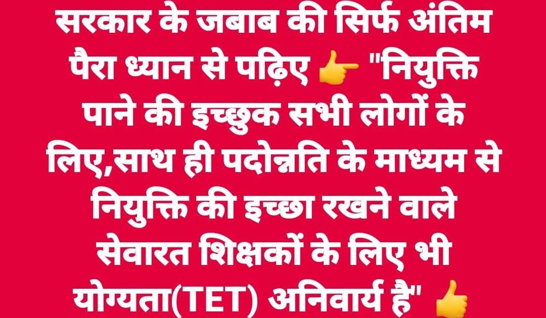 सरकार के जबाब की सिर्फ अंतिम पैरा ध्यान से पढ़िए “नियुक्ति पाने की इच्छुक सभी लोगों के लिए, साथ ही पदोन्नति के माध्यम से नियुक्ति की इच्छा रखने वाले सेवारत शिक्षकों के लिए भी योग्यता (TET) अनिवार्य है” – UpdateMarts| PRIMARY KA MASTER | SHIKSHAMITRA | Basic Shiksha News