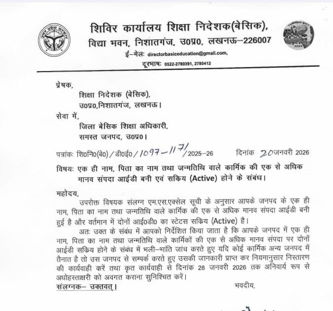 एक ही नाम, पिता का नाम तथा जन्मतिथि वाले कार्मिक की एक से अधिक मानव संपदा आईडी बनने एवं एक्टिव होने पर उसकी जांच कर नियमानुसार कार्रवाई करने के संबंध में 20 जनवरी 2026 का आदेश – UpdateMarts| PRIMARY KA MASTER | SHIKSHAMITRA | Basic Shiksha News