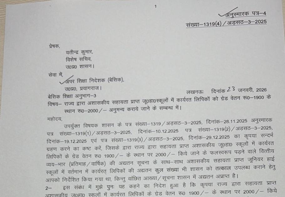 राज्य द्वारा अशासकीय सहायता प्राप्त जूनियर हाई स्कूलों में कार्यरत लिपिक को ग्रेड वेतन 1900 के स्थान पर 2000 अनुमन्य ...