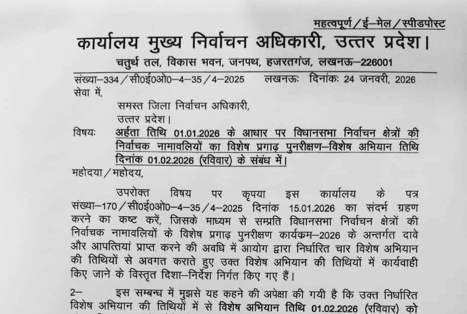 अर्हता तिथि 01.01.2026 के आधार पर विधानसभा निर्वाचन क्षेत्रों की निर्वाचक नामावलियों का विशेष प्रगाढ़ पुनरीक्षण-विशेष अभियान तिथि दिनांक 01.02.2026 (रविवार) के संबंध में। – UpdateMarts| PRIMARY KA MASTER | SHIKSHAMITRA | Basic Shiksha News