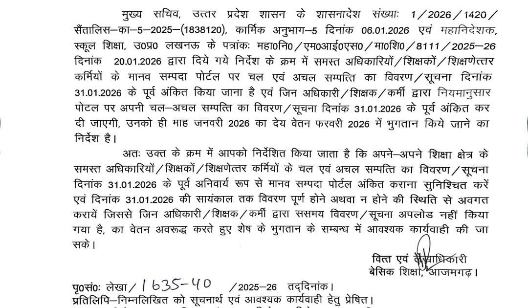 समस्त अधिकारियों/ शिक्षकों/ शिक्षणेत्तर कर्मियों के सम्बन्ध में दिनांक 31.01.2026 के पूर्व मानव सम्पदा पोर्टल पर चल एवं अचल सम्पत्ति का विवरण प्रस्तुत करने के सम्बन्ध में। – UpdateMarts| PRIMARY KA MASTER | SHIKSHAMITRA | Basic Shiksha News