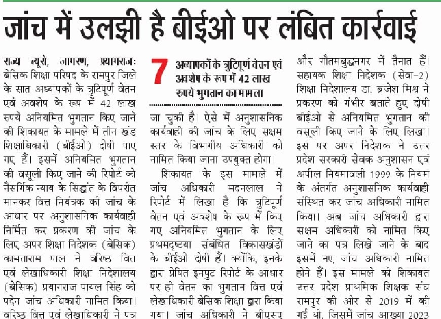 जांच में उलझी है बीईओ पर लंबित कार्रवाई बेसिक शिक्षा परिषद के प्रयागराज जिले के सात अध्यापकों के त्रुटिपूर्ण वेतन ...