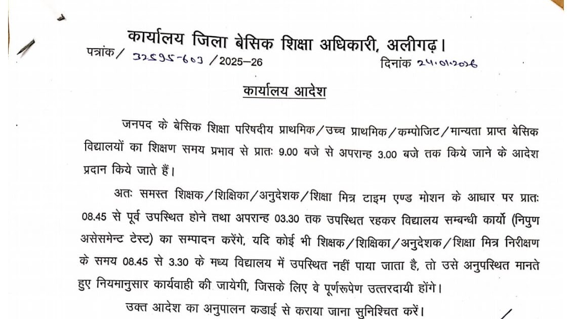 “`अजब–गजब : पूरे प्रदेश में परिषदीय स्कूल प्रातः 09:00 बजे से अपराह्न 03:00 बजे तक। लेकिन अलीगढ़ में शिक्षक ...