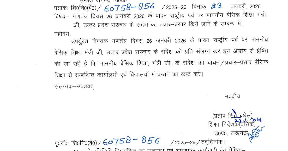गणतंत्र दिवस 26 जनवरी 2026 के पावन राष्ट्रीय पर्व पर माननीय बेसिक शिक्षा मंत्री जी, उत्तर प्रदेश सरकार के संदेश का प्रचार-प्रसार किये जाने के सम्बन्ध में। – UpdateMarts| PRIMARY KA MASTER | SHIKSHAMITRA | Basic Shiksha News