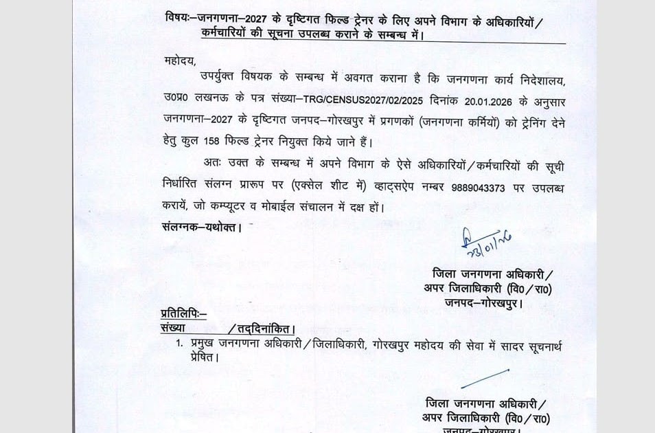 गोरखपुर जनगणना-2027 के दृष्टिगत फिल्ड ट्रेनर के लिए अपने विभाग के अधिकारियों/कर्मचारियों की सूचना उपलब्ध कराने के सम्बन्ध में। ...