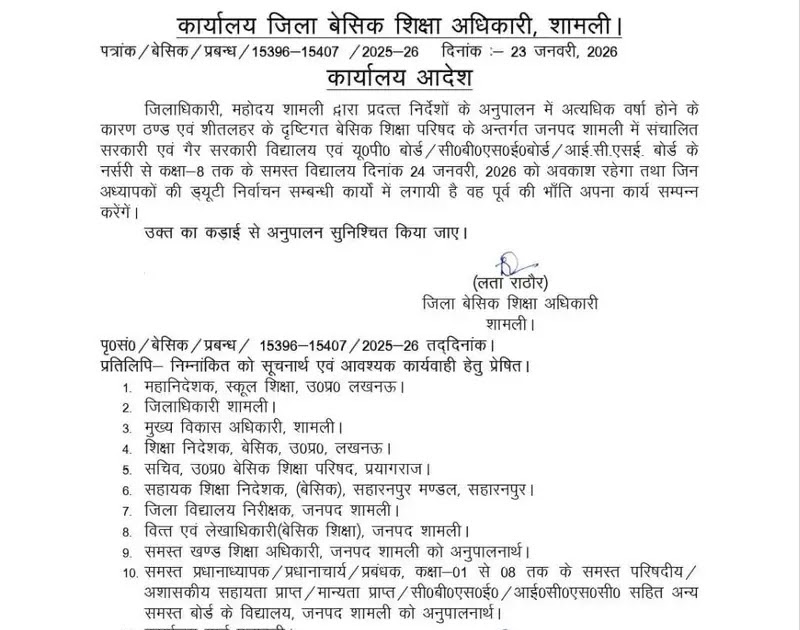 शामली। : जिले में ठंड और शीतलहर के चलते 24 जनवरी 2026 को नर्सरी से कक्षा 8 तक के ...