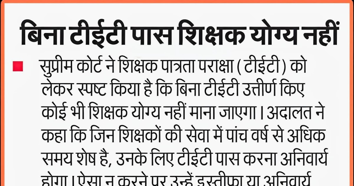 ● बिना टीईटी पास शिक्षक योग्य नहीं. ● सुप्रीम कोर्ट ने शिक्षक पात्रता परीक्षा (टीईटी) को लेकर स्पष्ट किया ...