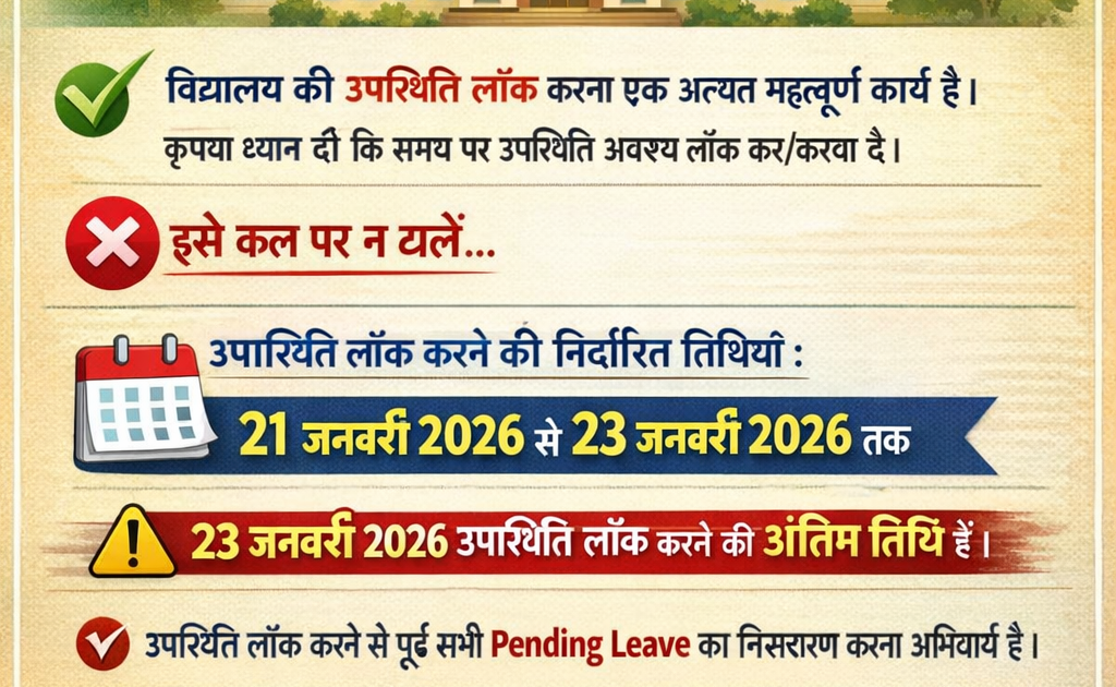 उपस्थिति लॉक (Attendance Lock) हेतु आवश्यक सूचना – जनवरी 2026 – UpdateMarts| PRIMARY KA MASTER | SHIKSHAMITRA | Basic Shiksha News