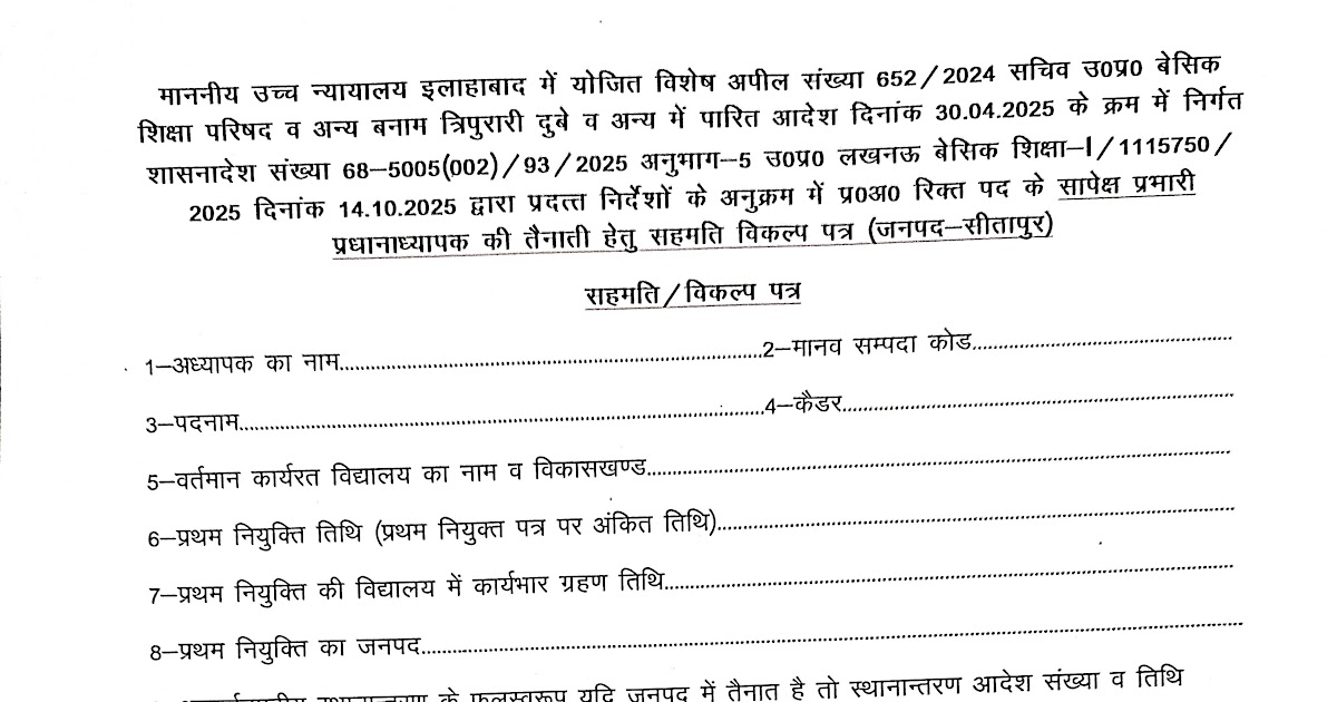 सीतापुर- माननीय उच्च न्यायालय द्वारा पारित आदेश के क्रम में निर्गत शासनादेश दिनांक 14.10.2025 के अनुपालन में प्रभारी प्रधानाध्यापक की तैनाती हेतु सहमति/विकल्प पत्र लेने के संबंध में जिला बेसिक शिक्षा अधिकारी महोदय का आदेश – UpdateMarts| PRIMARY KA MASTER | SHIKSHAMITRA | Basic Shiksha News