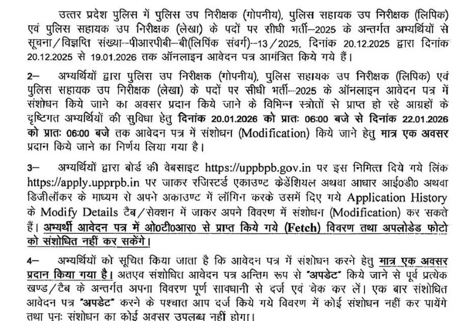 🚨UP Police SI (गो.नि./लिपिक/लेखा) भर्ती–2025 के आवेदन में सुधार (Modification) का एक आख़िरी मौका दिया गया है। ➡️सुधार की ...
