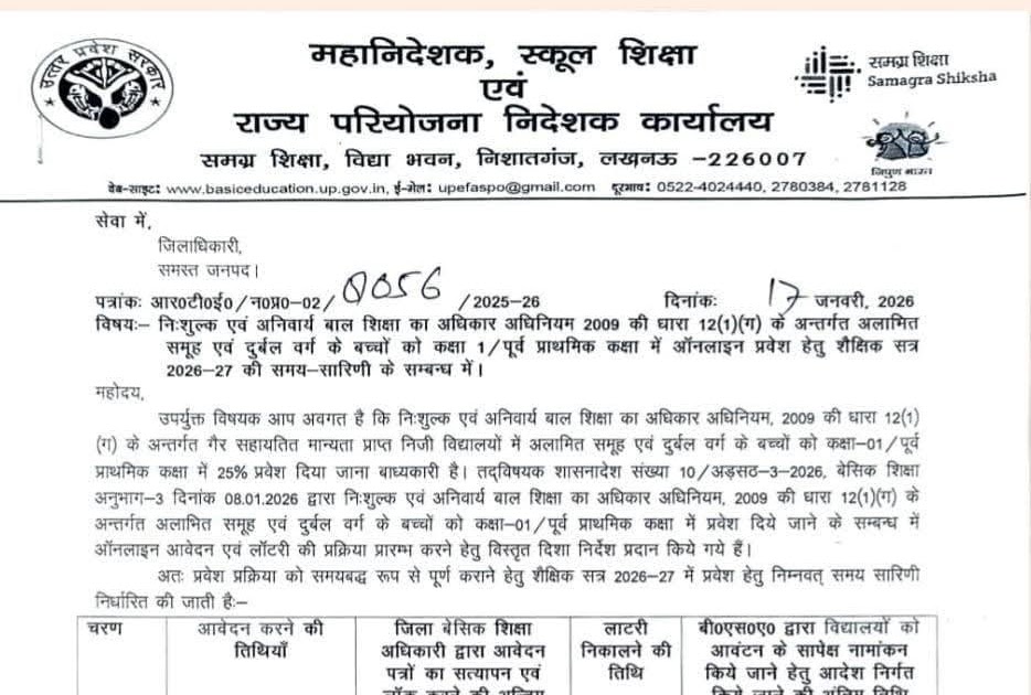 📢 महत्वपूर्ण सूचना: RTE 12(1)(ग) उत्तर प्रदेश 2026–27: कक्षा 1/पूर्व-प्राथमिक में निःशुल्क प्रवेश हेतु ऑनलाइन आवेदन व लॉटरी तिथियां घोषित – UpdateMarts| PRIMARY KA MASTER | SHIKSHAMITRA | Basic Shiksha News