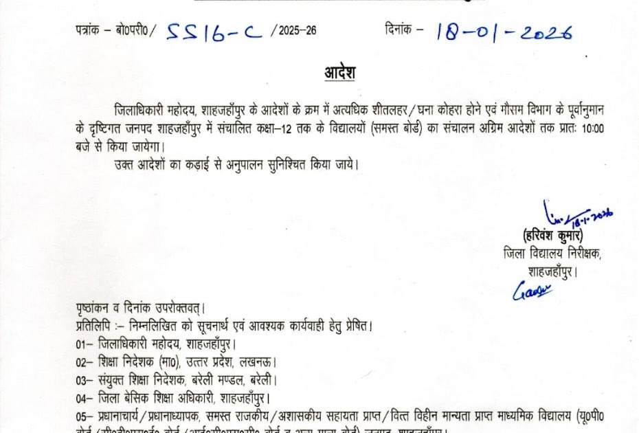 शीतलहर व घने कोहरे के कारण शाहजहाँपुर में कक्षा 1 से 12 तक के विद्यालय प्रातः 10 बजे से ...