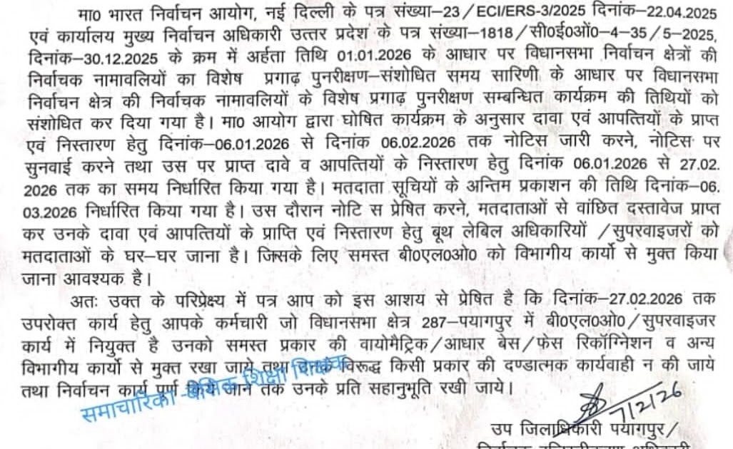 बहराइच:-दिनांक-27.02.2026 तक* बी०एल०ओ० / सुपरवाइजर को समस्त प्रकार की *वायोमैट्रिक/आधार बेस/फेस रिकॉग्निशन व अन्य विभागीय कार्यों से मुक्त रखा* जाये ...