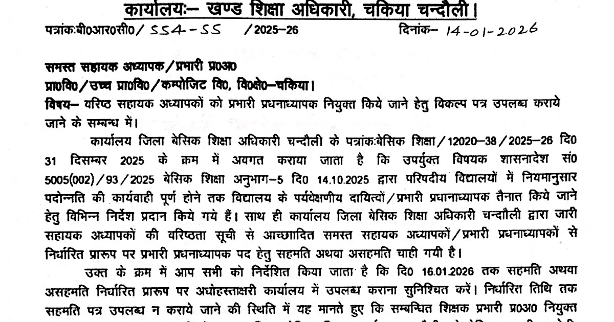 प्रभारी प्रधानाध्यापक हेतु विकल्प पत्र दिए जाने के सम्बंध में *विद्यालय प्रभारी की तैनाती 2026* – 1. प्राथमिक स्तर( ...