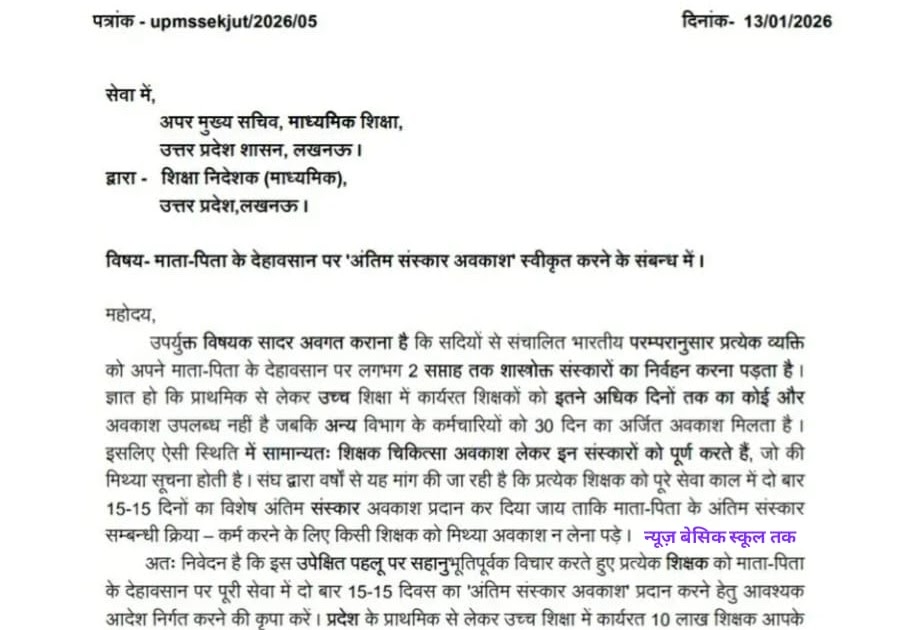 माता-पिता के देहावसान पर ‘अंतिम संस्कार अवकाश’ स्वीकृत करने के संबन्ध में ज्ञापन – UpdateMarts| PRIMARY KA MASTER | SHIKSHAMITRA | Basic Shiksha News