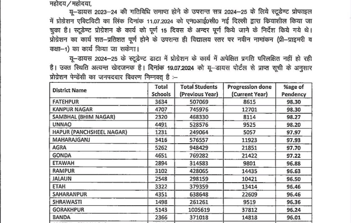 यू-डायस 2024-25 के लिये स्टूडेण्ट प्रोफाइल के अन्तर्गत समस्त विद्यालयों के स्टूडेण्ट डाटा को शत-प्रतिशत प्रोग्रेशन किये जाने के सम्बन्ध में महानिदेशक स्कूल शिक्षा का आदेश जारी